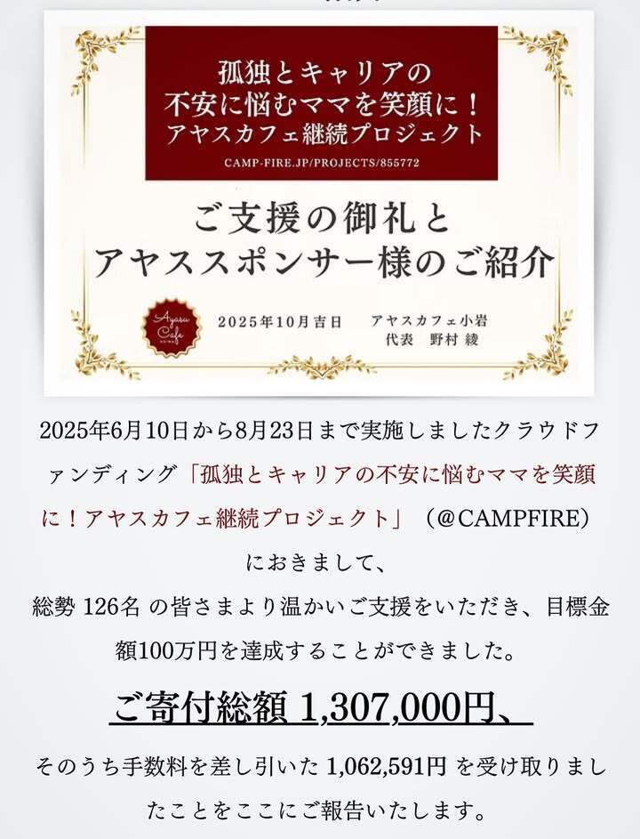 #アヤスカフェ #ご支援ありがとうございます #クラファン終了報告 #ご支援者さま紹介 #子育て支援 #地域コミュニティ